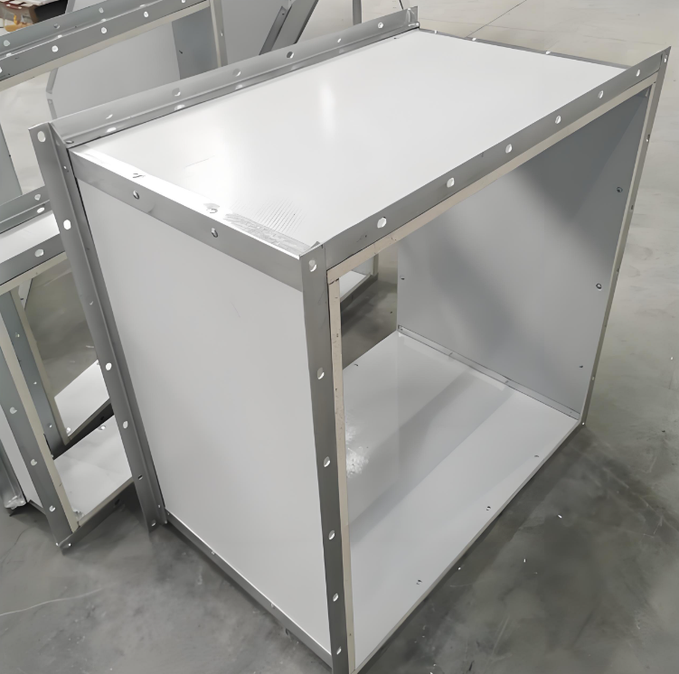 1标准依据:GB/T17428-2009《通风管道耐火试验方法》. 2.产品名称:通风管道; 3.耐火性能:60min 4.风管由0.2mm彩钢板、高温胶和14mm镁质防火板(密度:900kg/m3)组成; 5.风管之间用金属法兰(L30x3mm 薄钢)通过M8x25mm 螺栓连接定,间距100-120mm;6.镁质防火板与彩钢板之间均涂抹高温胶,高温胶厚度为1.8mm; 7.镁质复合风...